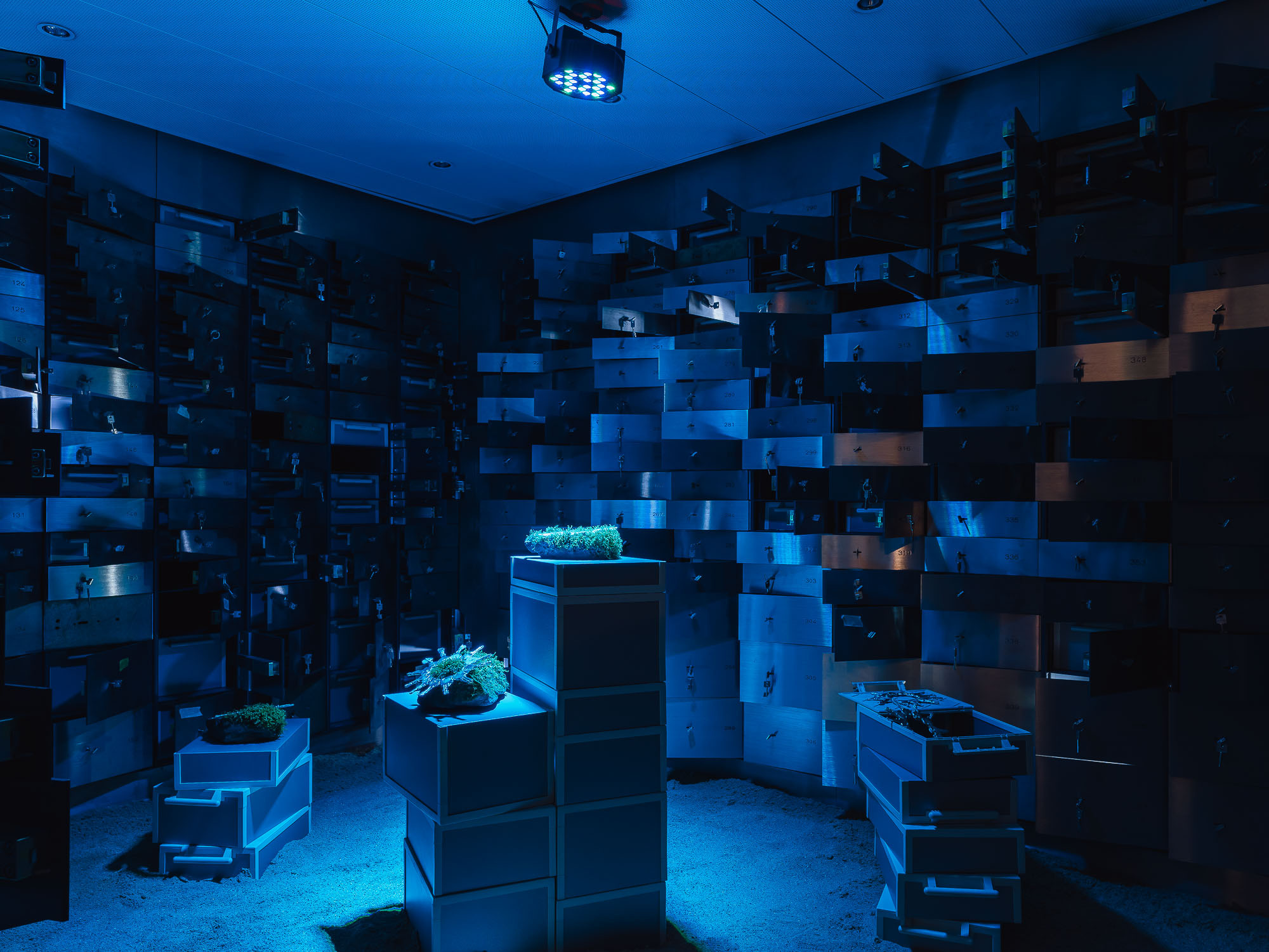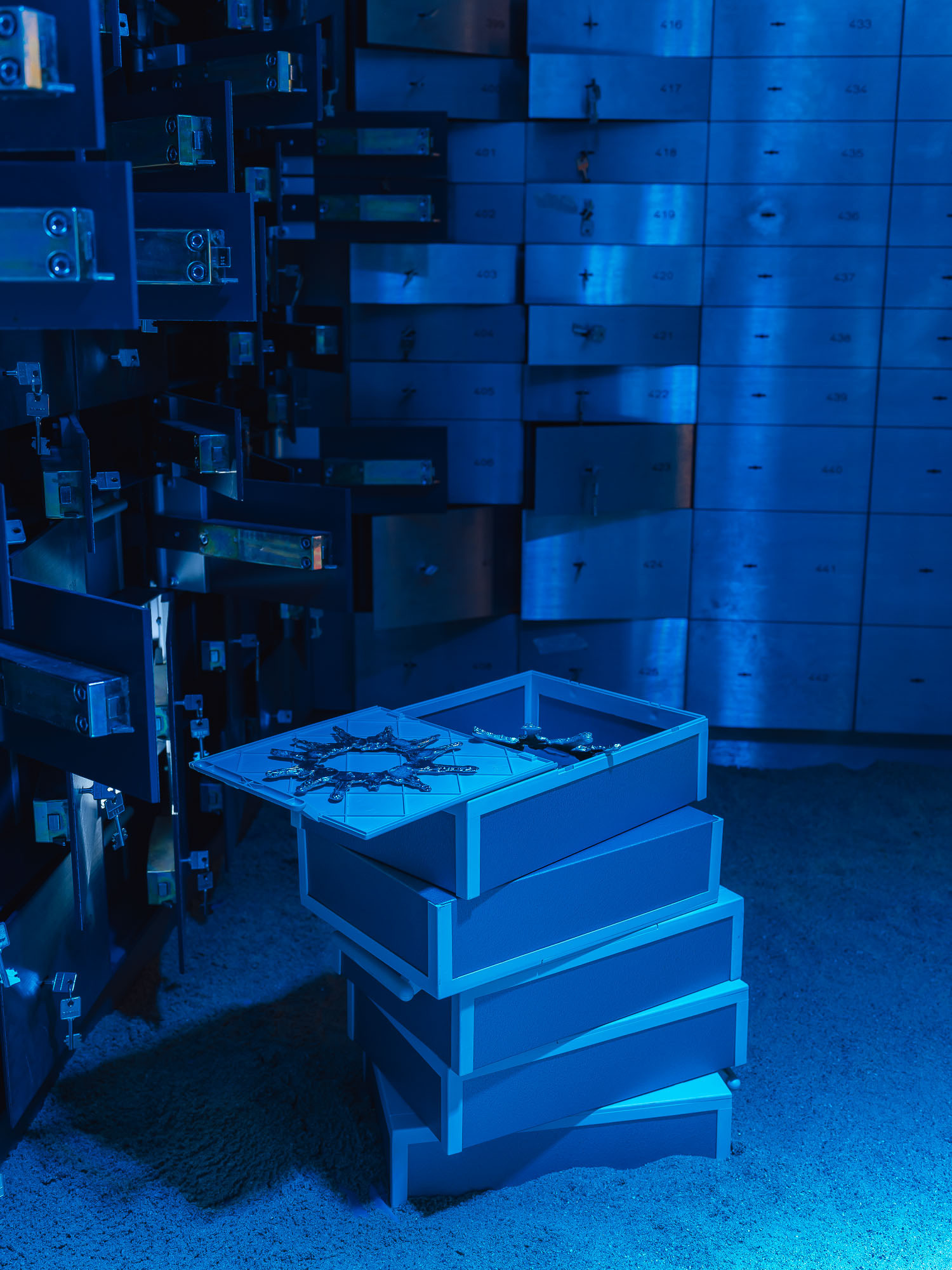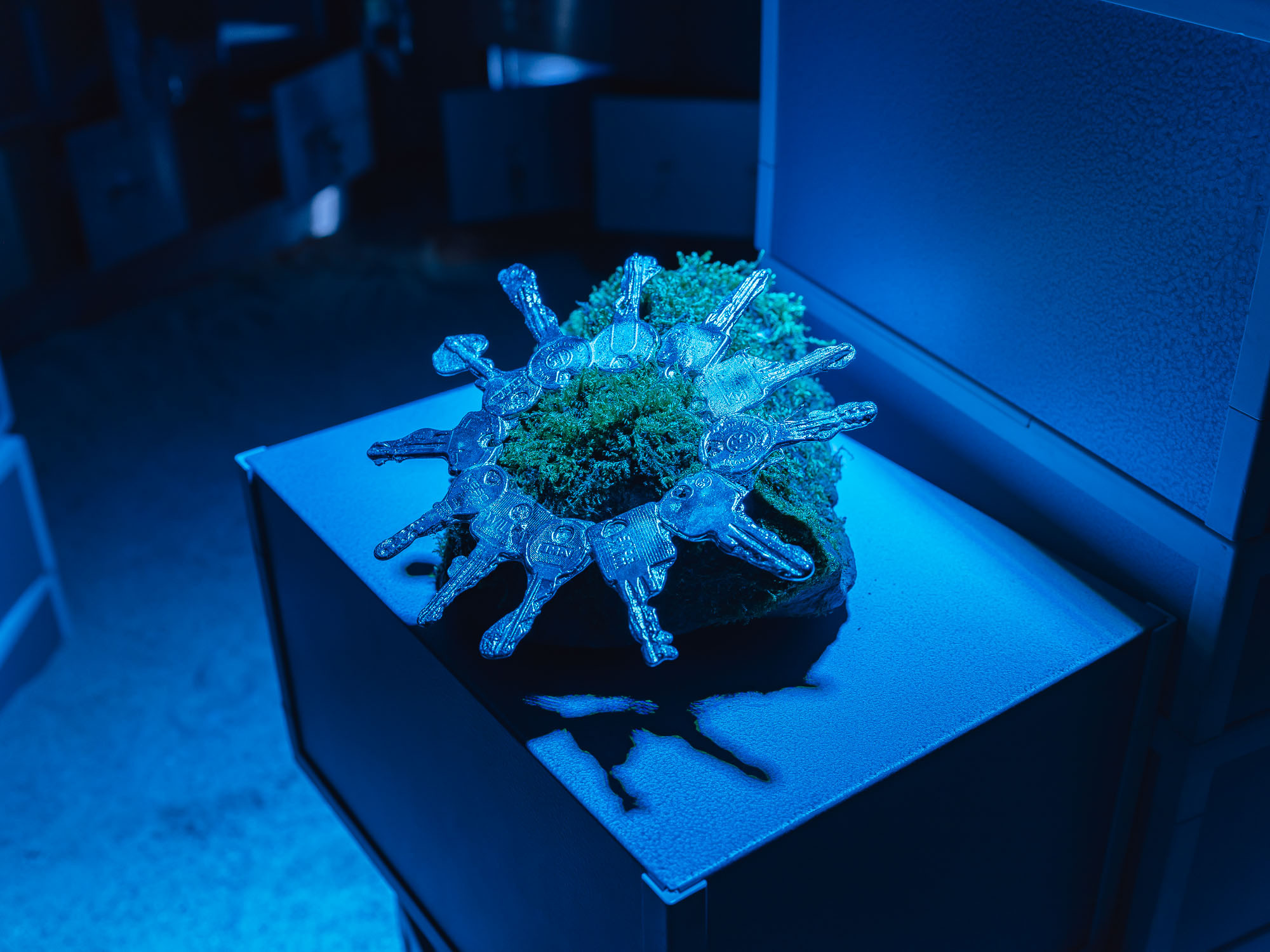 Juli Gebhardts Intervention "Out of bounds" in der Reihe "Retour de Paris" untersucht Normen und normative Verhaltensweisen in zunehmend verflochtenen Arbeits-, Unternehmens-, Gaming- und Netzkulturen. Ähnlich wie Videospieler*innen mittels Glitches oder Shortcuts die innere Logik digitaler Welten zu umgehen suchen, verhandelt die Künstlerin die Standards der neoliberalen Leistungsgesellschaft neu. Zentrales Element der Ausstellung ist ein Abguss von Gebhardts Schlüsselbund, der als Artefakt zwischen Alltagsobjekt und imaginärem Loot im Tresorraum der ehemaligen Bankfiliale inszeniert wird. Die Arbeit stellt dabei gleichermaßen biografische wie systemische Gegebenheiten von Zugang, Sicherheit und Besitz in Frage.